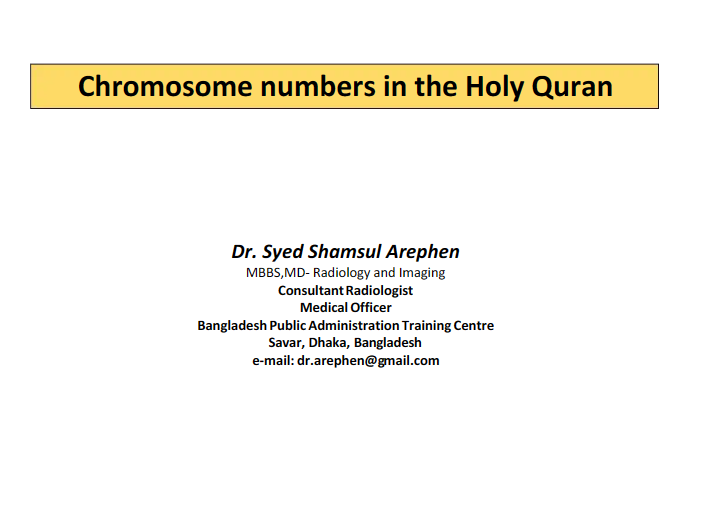 Is the Holy Quran being a book about genetics? The answer is ‘No’. But it is a book from the Almighty Allah for mankind. It contains ‘signs’ of God. Almighty Allah has indicated the specific number of chromosomes in the chapters and verses of the Quran. The 16th chapter of the Holy Quran ‘The Bee’ and drone bees have 16 chromosomes. The chapter ‘Human being’ (76th chapter) contains 31 verses. Human chromosome number 46 is the 31st composite number. The word ‘Cow’, ‘Dog, ‘Camel’,’Pigs’ etc. found just before or after or at the position of their specific chromosome number.
