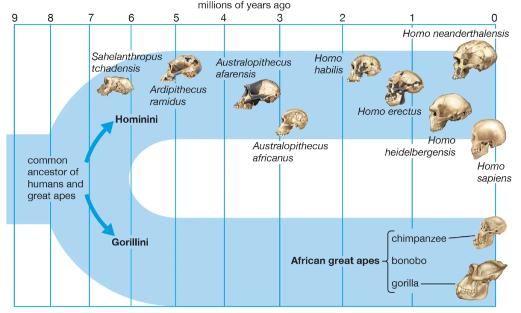 - Sahelanthropus tchadensis (প্রায় ৭ মিলিয়ন বছর আগে): মানুষের প্রাচীনতম সম্ভাব্য পূর্বপুরুষ বলে মনে করা হয়।